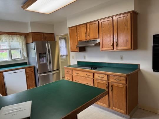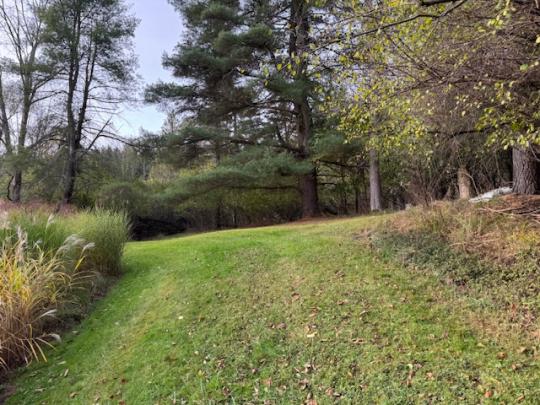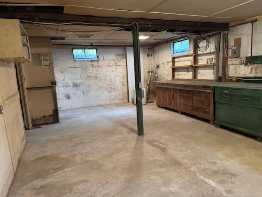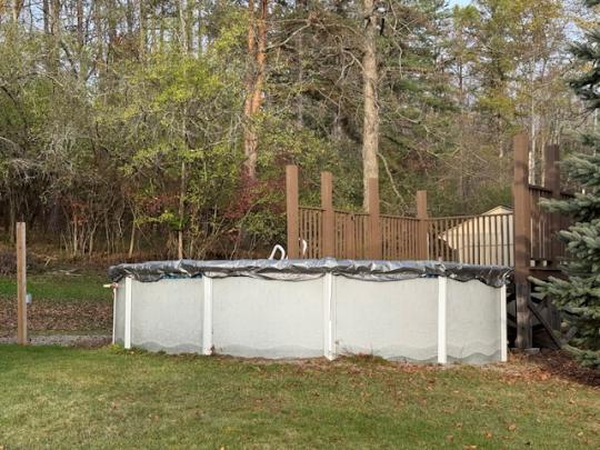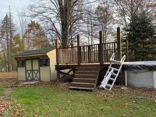 Spacious home located on .84 acres with a circular blacktop driveway.  This property overlooks the Village with a wooded lot behind the home, an above-ground swimming pool and storage building.  Enter this home from the front deck into the foyer with a closet.  A large picture window brightens the living room with a gas fireplace and hardwood floors.  The formal dining area has French doors that open onto the back deck with views of the woods and coy pond with fountains and waterfalls.  The eat-in kitchen includes a refrigerator, garbage disposal, dishwasher, electric cooktop and built-in oven and leads to the mudroom and side door.  On the main floor you will also find the spacious primary bedroom, a second bedroom, a full bath with heated ceramic tile flooring, a walk-in ceramic tile shower and two hall closets.  Upstairs you will find 2 additional bedrooms, an office and a full bath.  The full basement includes a family room with a wet bar, workshop, storage room and a door that leads to the 1 car garage.